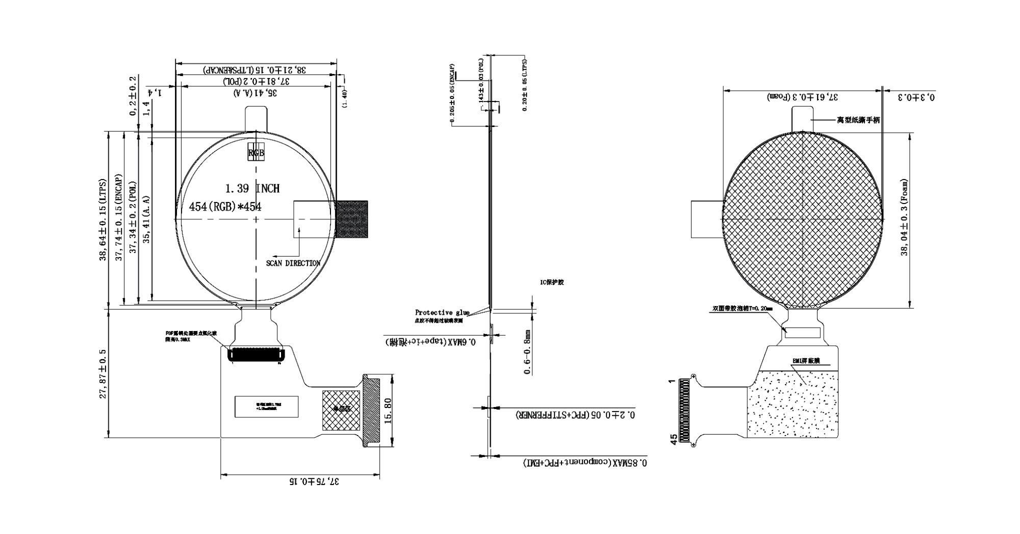1) 1.39 inch AMOLED display panel, 454x454 resolution,GDOD0139CP45 * 1pc