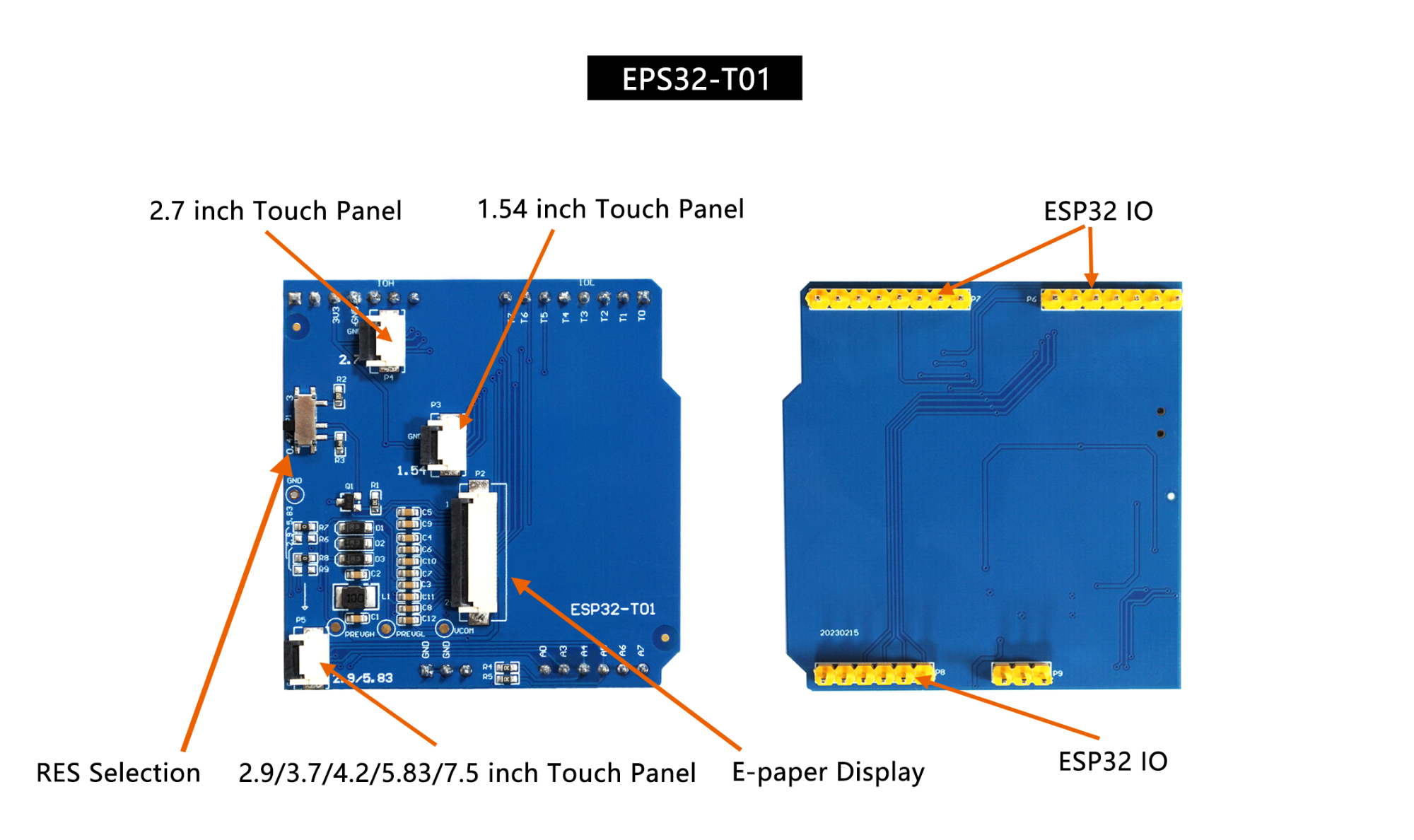 The epaper adapter board ESP32-T01 is aim to help users to learen how to use the E-paper Display easier, and it is used for Good Display's SPI interface E-paper Display. It also has interface for touch screen. It can realize the collaboration of touch screen and e-paper display to facilitate the early debugging of customers.