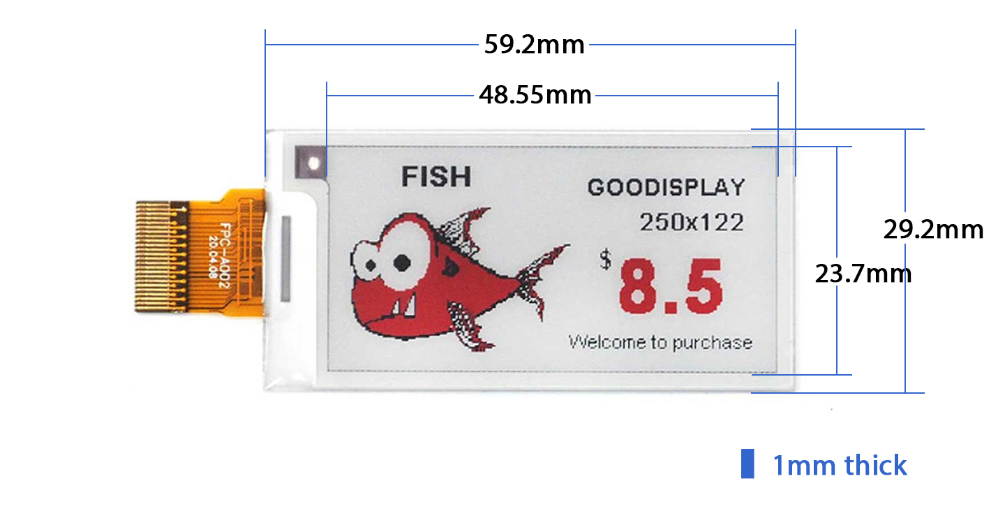 Introducing the 2.13-inch color e-ink display, perfect for low-power devices powered by solar energy or batteries. Ideal for electronic price tags, smart home devices, and portable displays, this e-ink screen ensures excellent display quality with minimal power consumption. The GDEY0213Z98 is your go-to solution for efficient, sustainable display technology. |