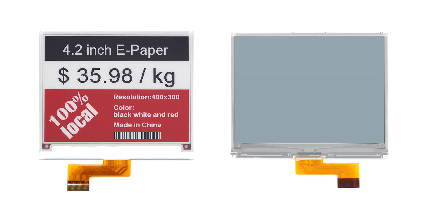 This 4.2 inch e-ink display GDEQ042Z21 is perfect for low power devices powered by solar or batteries, or the products that require slow updates or semi-static content such as digital price tags, electronic shelf labels or signage.