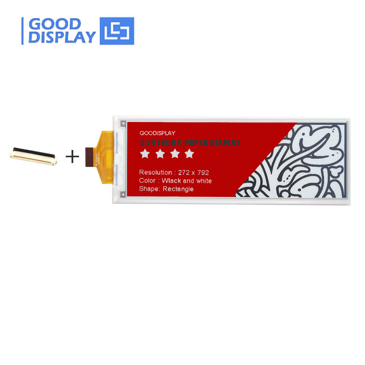 This is a set of epaper display module consist of 5.79 inch e-ink display monochrome electronic paper screen GDEY0579T93 and its connector board DESPI-C579, 792x272 resolution, SPI interface, and the electronic paper screen is capable to display images with black and white content. Once these e-ink display modules are updated they don't require any power and can actually be disconnected entirely and the content will remain on the display indefinitely. Your image holds indefinitely without power – put up your image, then shut down the power.