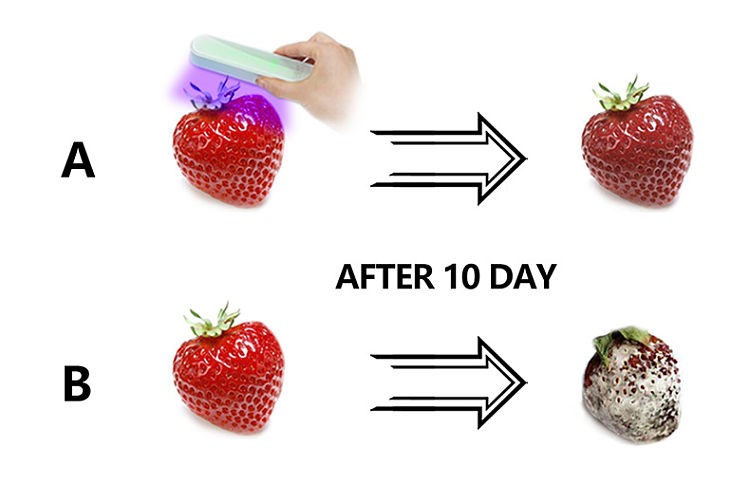 Two strawberries A and B were tested. A strawberry was irradiated with an ultraviolet sterilization stick for 5 minutes every day, and B strawberry was placed naturally. After 10 days, A strawberry is only dehydrated, and the surface of B strawberry is completely moldy.