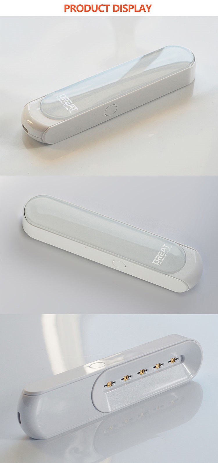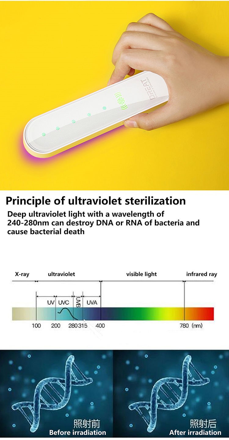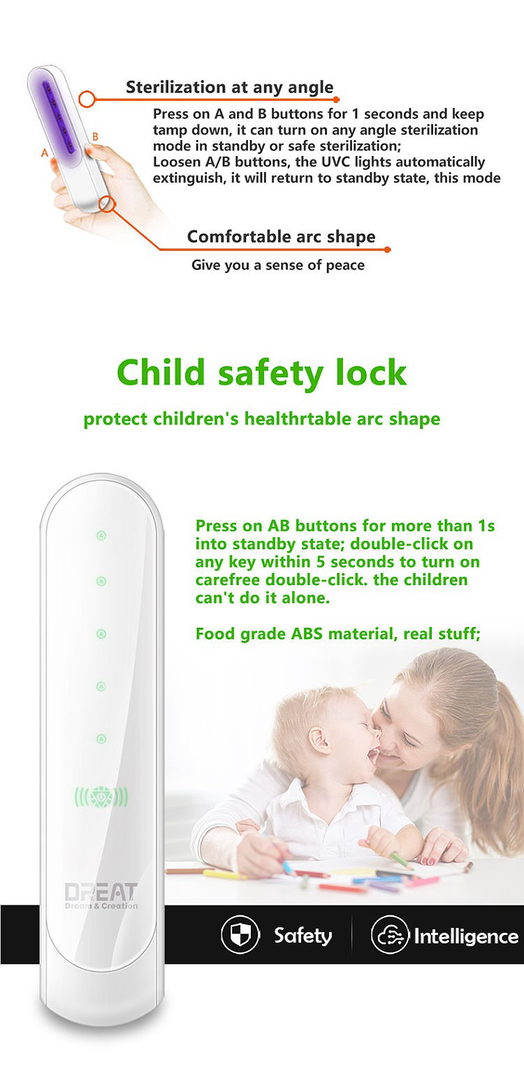 GDUDDC-01 is a portable handheld UVC sterilizer that is easy to carry. Using selected ABS materials and advanced LED lamp beads to ensure effective sterilization, this product has a child safety lock function, which is safe to use.